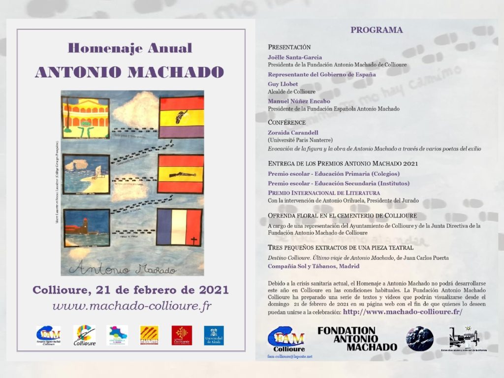La Fundación Antonio Machado de Collioure se une a los actos de celebración del 82º aniversario de la muerte del poeta con un completo programa de actividades que se desarrollará el domingo 21 de febrero en formato on-line. Para más información: www.machado-collioure.fr